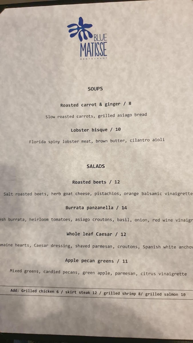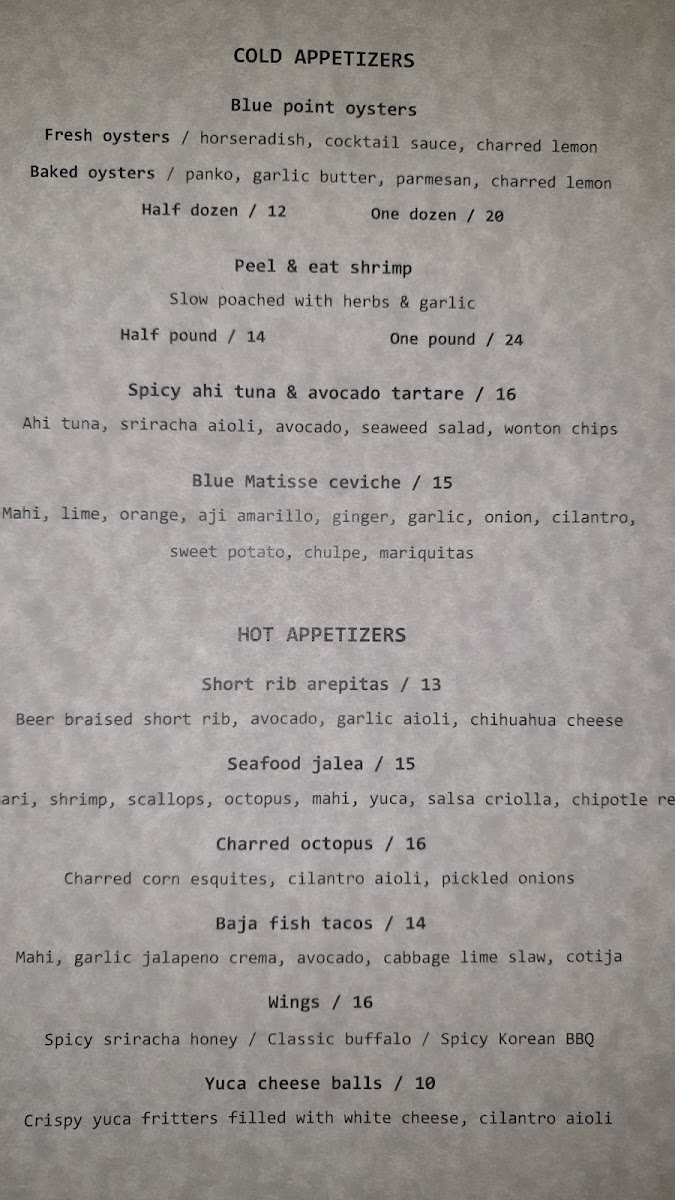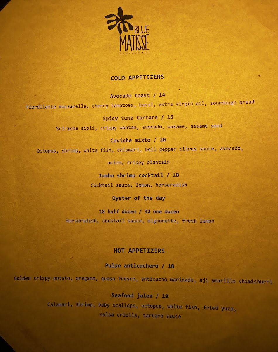 Blue Matisse offers a thoughtfully curated menu that reflects its multifaceted atmosphere, blending Latin American flavors with refined dining and casual lounge vibes. The selection includes a balance of comforting classics and inventive dishes, perfect for enjoying a relaxed lunch, a lively evening out, or a leisurely weekend brunch.