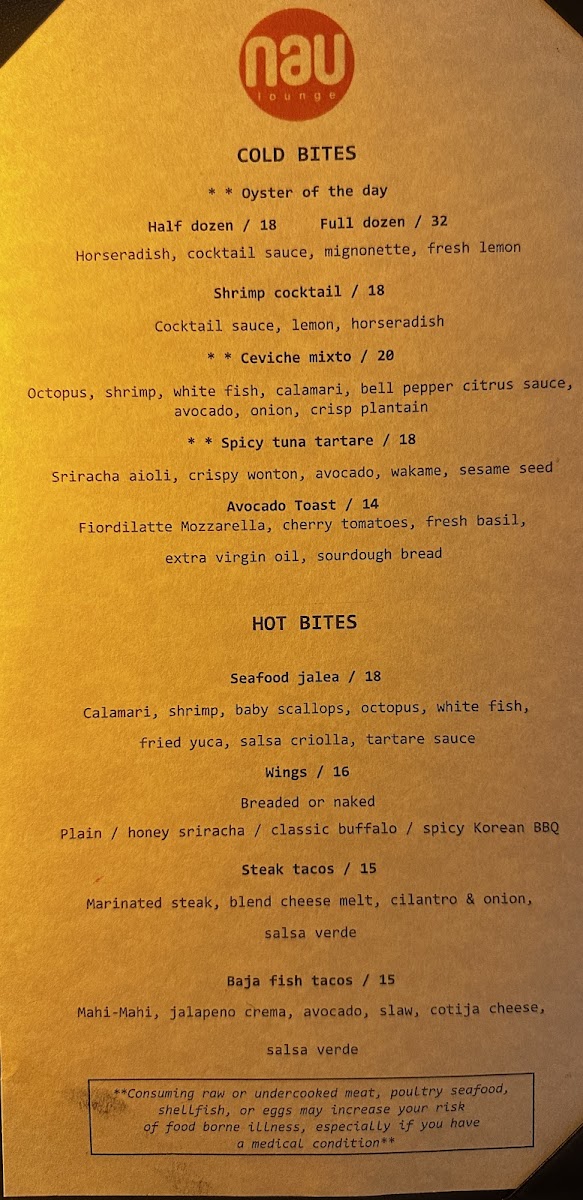 The menu features a variety of options from fresh Blue Point Oysters and Grilled Octopus to hearty entrees like Beer Braised Short Rib and Solomo Angus con Tostones. Light bites such as Avocado Toast and Street Tacos fit effortlessly with the vibrant cocktail bar scene, while rich desserts like Passion Fruit Cheesecake and Gianduia Shortbread provide a sweet finish to any meal.