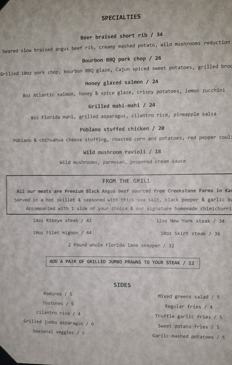 Sides range from crisp Mixed Greens and Yuca with Bacon Mojo to indulgent Truffle Garlic Fries, complementing both family-style dinners and more intimate fine dining experiences. Prosecco and expertly crafted cocktails like the Coctel Campechana enhance the lounge’s inviting atmosphere, encouraging guests to unwind and savor every moment.